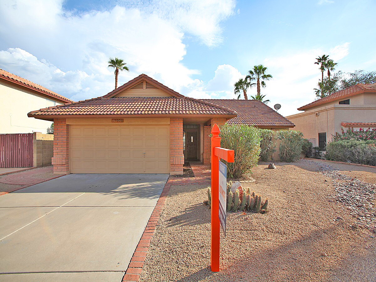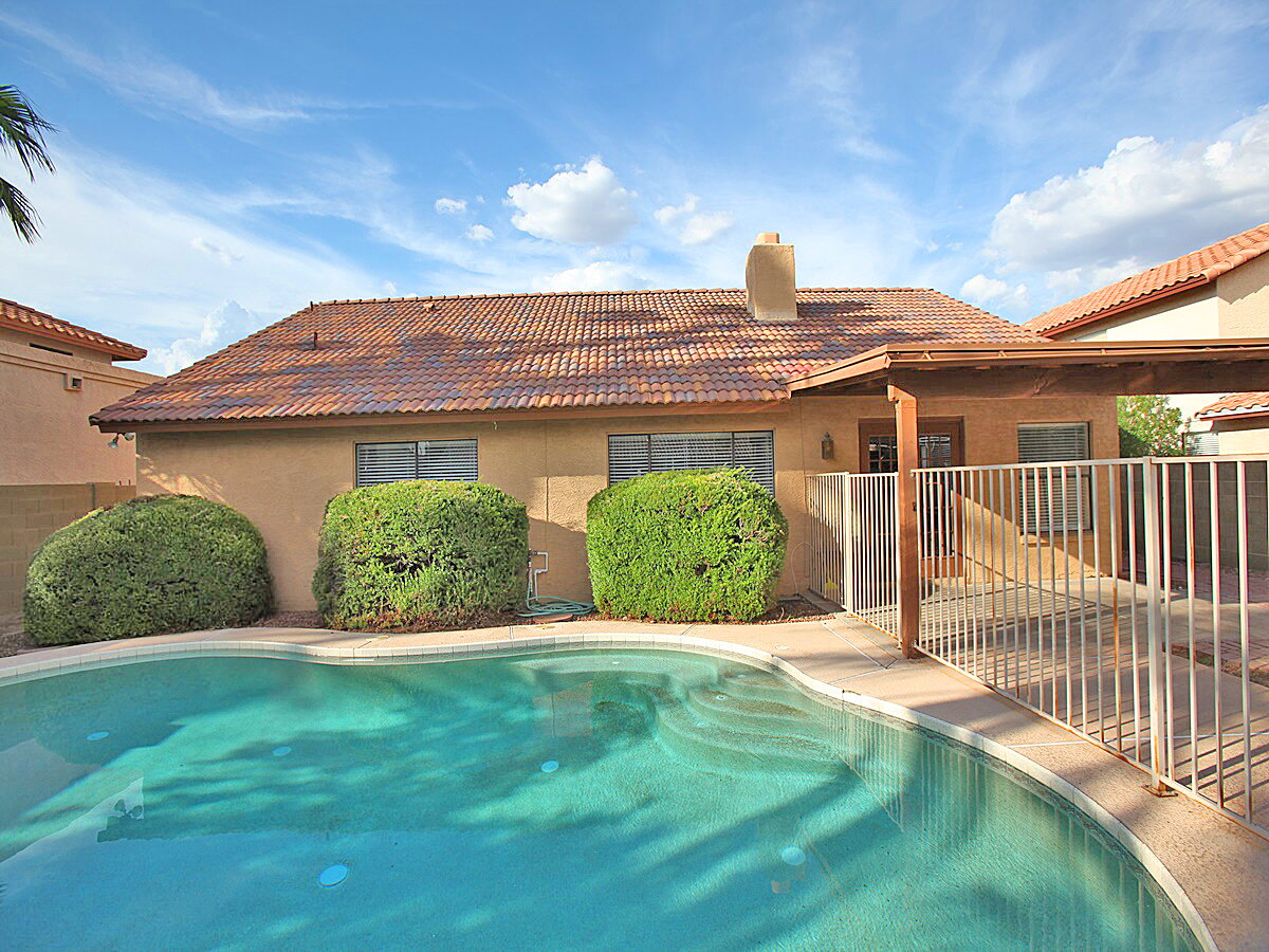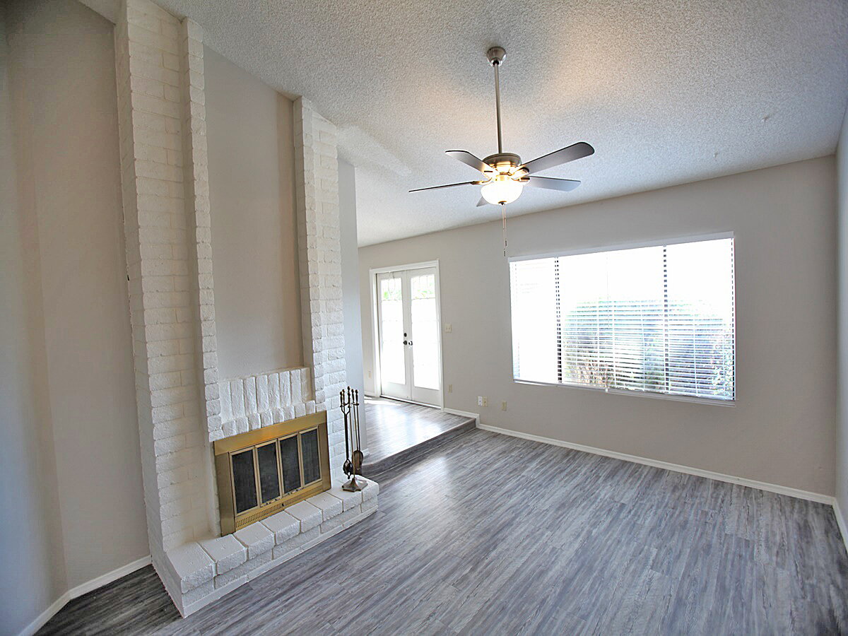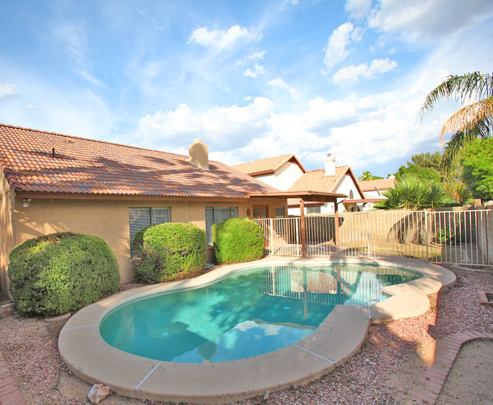 3 Bedroom + 2 Bathroom home in Arrowhead Ranch. Upgrades throughout!! Beautiful cabinets and granite counters in the kitchen! Kitchen features stainless-steel appliances, range/oven, built-in microwave, dishwasher, refrigerator. Family room with fireplace. Ceiling fans and blinds throughout. Also includes washer and dryer. Backyard features covered patio, grassy area and beautiful swimming pool! 2 car garage with